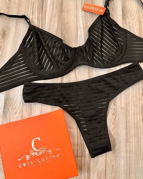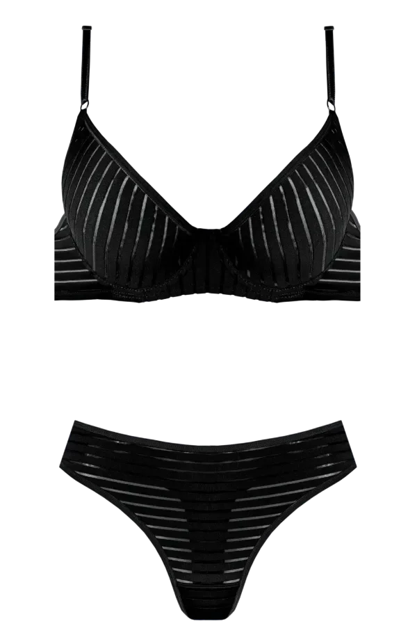 Elegancia y comodidad en un solo diseño. Este conjunto sin taza, con arco, está confeccionado en microfibra labrada con delicadas rayas que realzan la silueta. Incluye colaless a juego, ideal para quienes buscan estilo sin renunciar al confort.