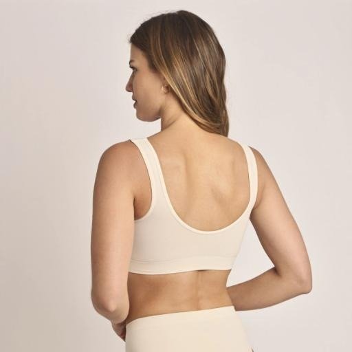 Su diseño sin aro ni relleno, con breteles anchos y espalda deportiva, ofrece un calce firme y confortable, ideal tanto para el uso diario como para momentos de relax.