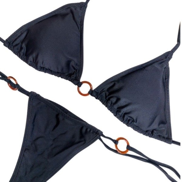 Triángulo con detalles únicos. Este conjunto cuenta con tazas desmontables, tres arandelas de carey en el corpiño y bombacha colaless regulable. Un diseño versátil con un toque artesanal y sofisticado.